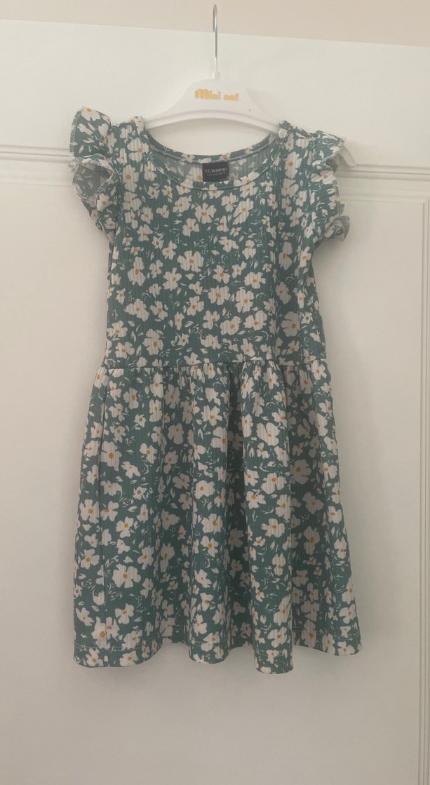Kız çocuk elbisesi, kısa kollu ve fırfırlı detaylara sahip. Gevşek kesimi ve yuvarlak yakasıyla pastel yeşil çiçek desenli bohem tarzda, yumuşak sentetik kumaştan yapılmıştır.