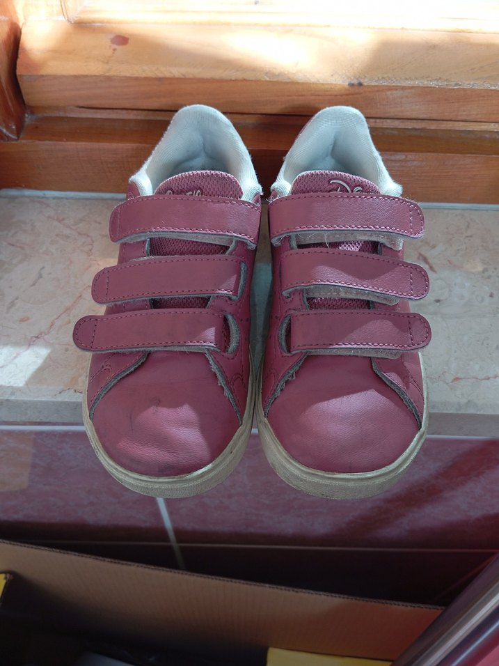 Pembe renkli, cırt cırtlı kayışlara ve kauçuk tabanlara sahip kız çocuk spor ayakkabısı. Pastel tonlarda ve desensiz sade bir tasarımı vardır.