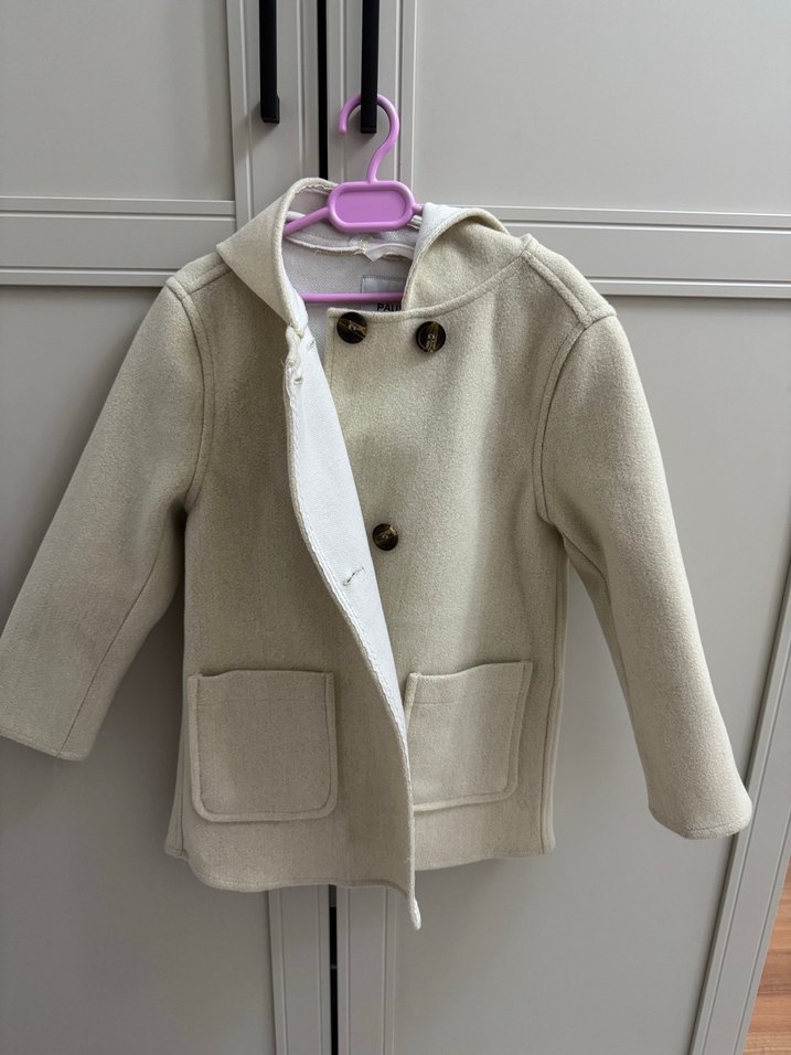 Kız çocukları için düğmeli ve kesimli yaka detaylı, beyaz renkte, yumuşak ve sıcak kumaştan yapılmış, rahat kesim ceket.