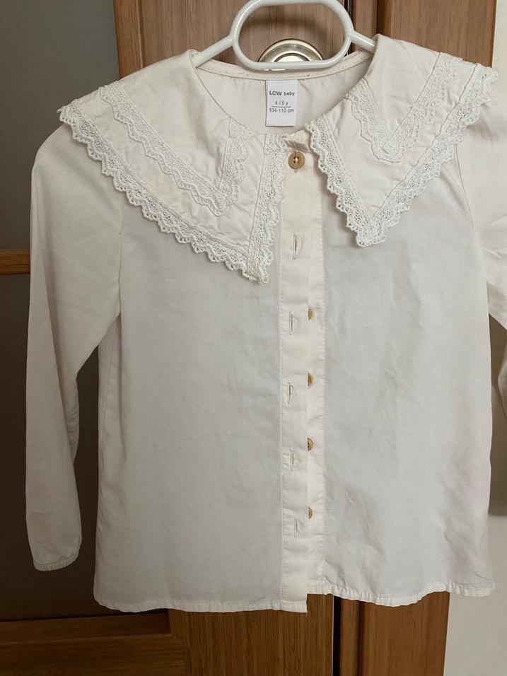Krem keten kumaştan, düğmeli yakalı kız çocuk gömleği. Uzun kollu, bol kesim ve vintage dantel yakaya sahip. Pastel ton, desensiz.