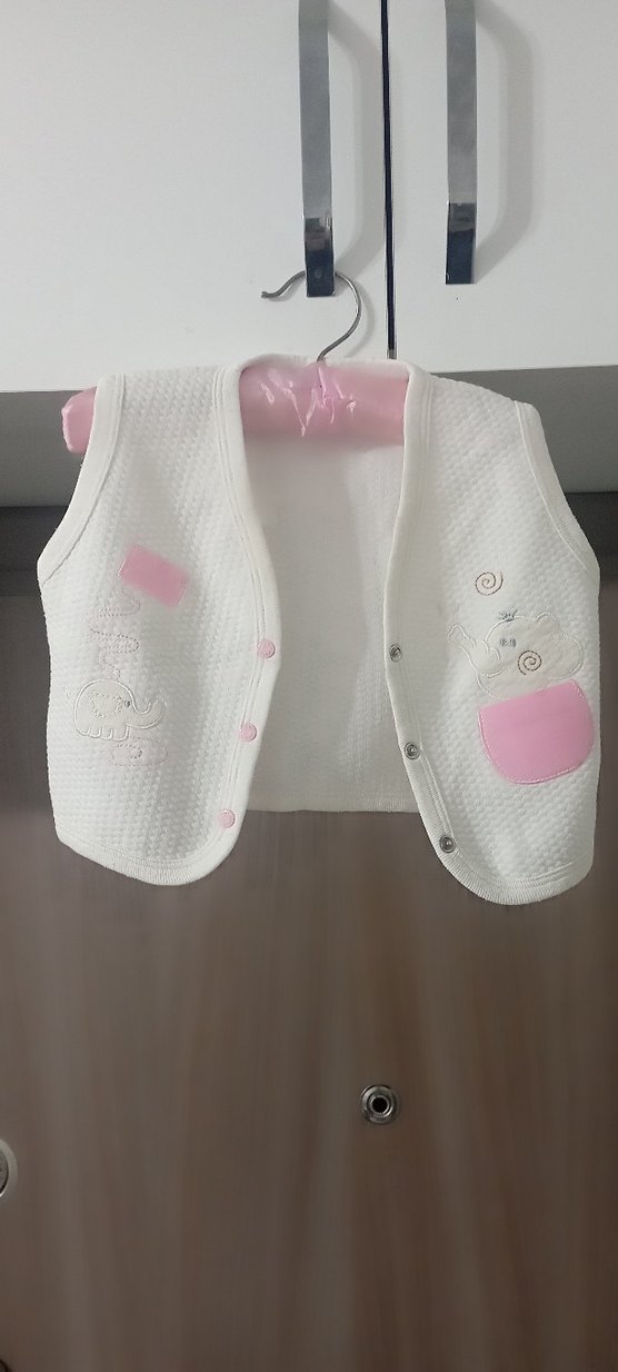 Düğmeli, yuvarlak yakalı kız çocuk beyaz yelek. Yumuşak sentetik kumaştan, nakışlı ve küçük pembe cep detaylı, sokak stiline uygun.