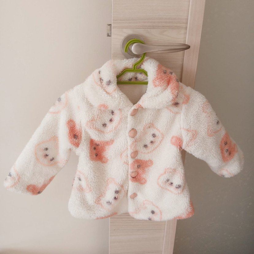 Kız çocukları için düğmeli, yuvarlak yakalı, bol kesim beyaz peluş ceket, pastel hayvan desenleriyle rahat ve şık.