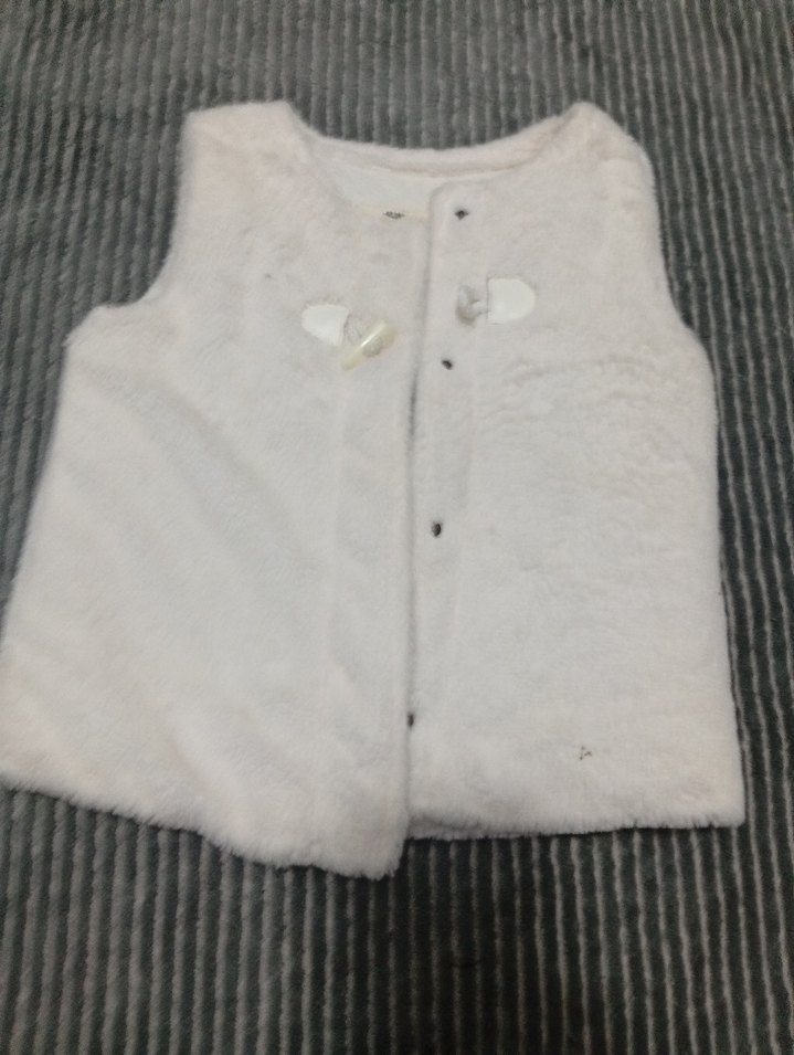 Düğmeli, kolsuz ve yuvarlak yakalı bu kız çocuk beyaz yelek, yumuşak ve sıcak bir kumaştan üretilmiştir.