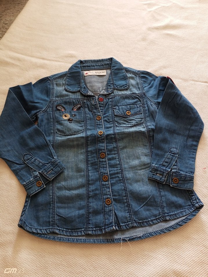 Kız çocukları için düğmeli, yakalı, uzun kollu ve bol kesim denim gömlek. Cepte küçük nakış detayı bulunur, rahat sokak stili için uygundur.