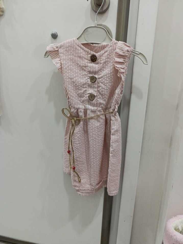 Pembe, düğmeli, halter yakalı ve nakış detaylı kız çocuk elbisesi. Kolsuz ve bohem tarzda, yumuşak sentetik kumaştan yapılmıştır. Kemerli detay içerir.