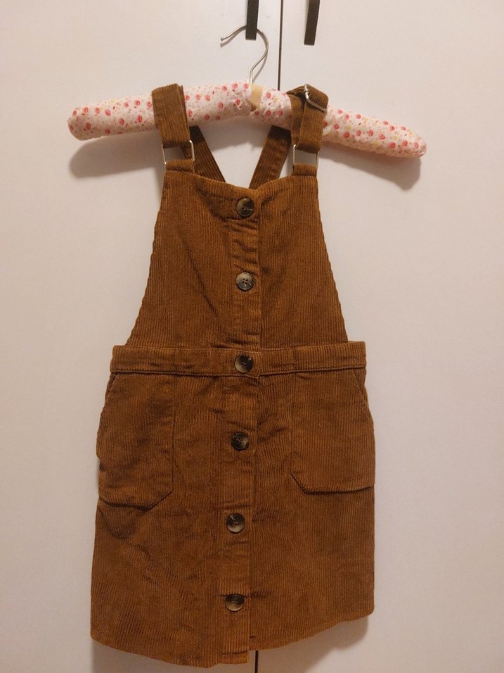 Kız çocukları için düğmeli, askılı, kahverengi ve bohem tarzda, yumuşak kadife dokulu kumaştan yapılmış dar kesim elbisedir.