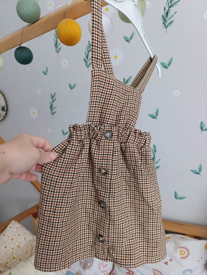 Kız çocuklar için düğmeli, askılı ve bol kesim elbise. Sentetik kumaştan, koyu kahverengi ekose desenli ve bisiklet yakalı, bohem tarzda.