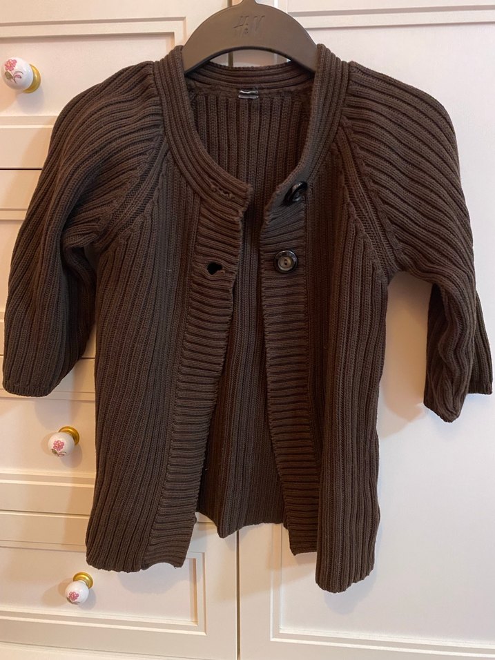 Kahverengi, düğmeli, uzun kollu, fitted kesim kız çocuk triko hırka. Düz ve sade tasarıma sahiptir.