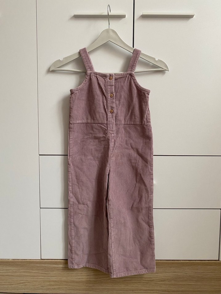 Pembe keten kumaştan yapılmış, düğmeli ve askılı, normcore tarzında kız çocuk tulumu. Rahat kesim ve desensiz tasarım içerir.