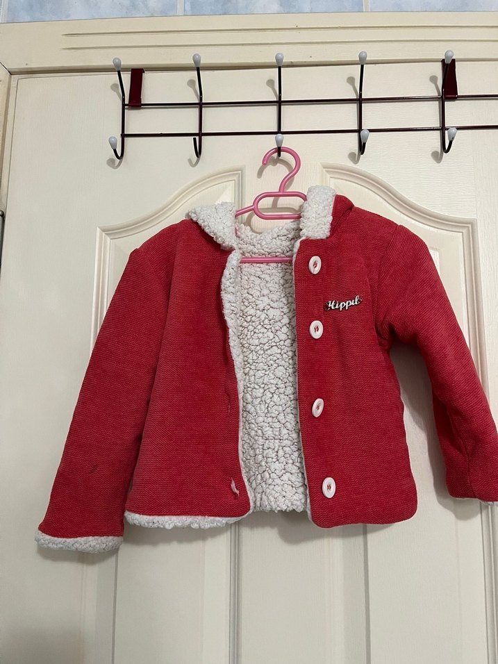 Düğmeli ön ve kırmızı renkli, yumuşak ve sıcak iç astarlı, yakası kesik detaylı kız çocuk montu. Trend sokak stili için uygun.