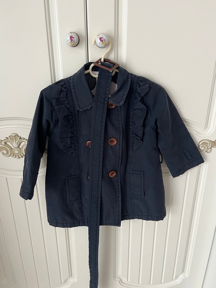 Düğmeli ön kısmı ve kesimli yaka tipi ile lacivert kız çocuk trençkot Düzenli kesimi, fırfır detayları ve kemeriyle şık bir görünüm sunar.