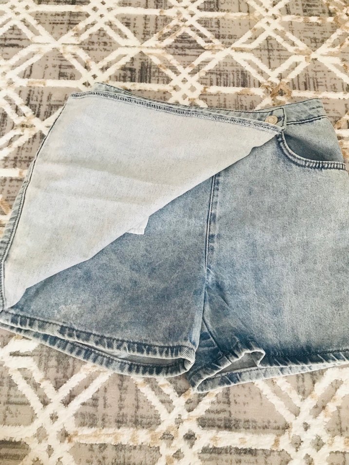Lcw Düğmeli, loose fit kesim ve mini boy kot şort. Mavi renkte, desensiz ve günlük rahat sokak stiline uygun.