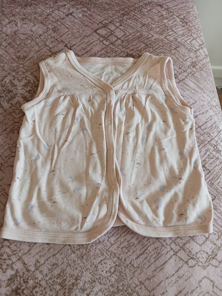 Düğmeli, pamuklu ve kolsuz kız çocuk yeleği. Gevşek kesimi ve pastel beyaz rengiyle sade ve rahat bir tasarıma sahiptir.