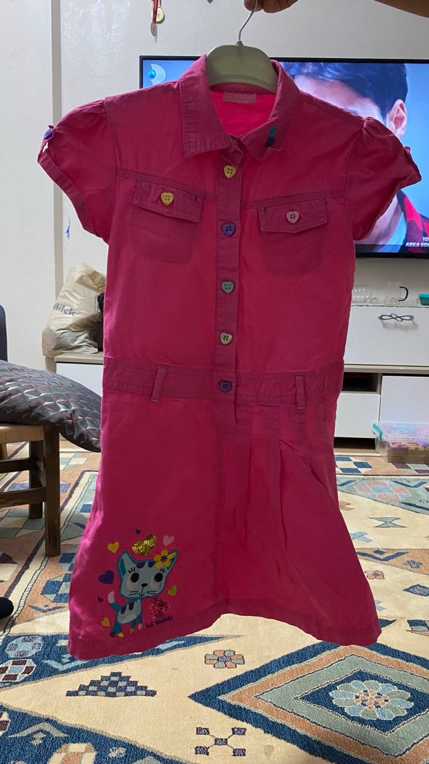Kız çocukları için düğmeli, kısa kollu, yakalı ve oturan kesime sahip pembe elbise. Renkli sentetik kumaştan, baskılı ve sokak tarzına uygun.