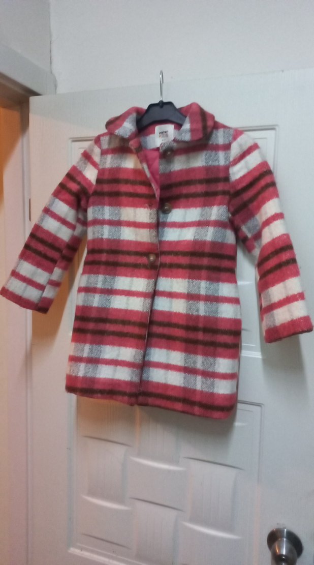 Kız çocuklarına uygun, düğmeli ve kesik yakalı, yumuşak kumaştan yapılmış, pembe ve gri ekose desenli bol kesim kaban.