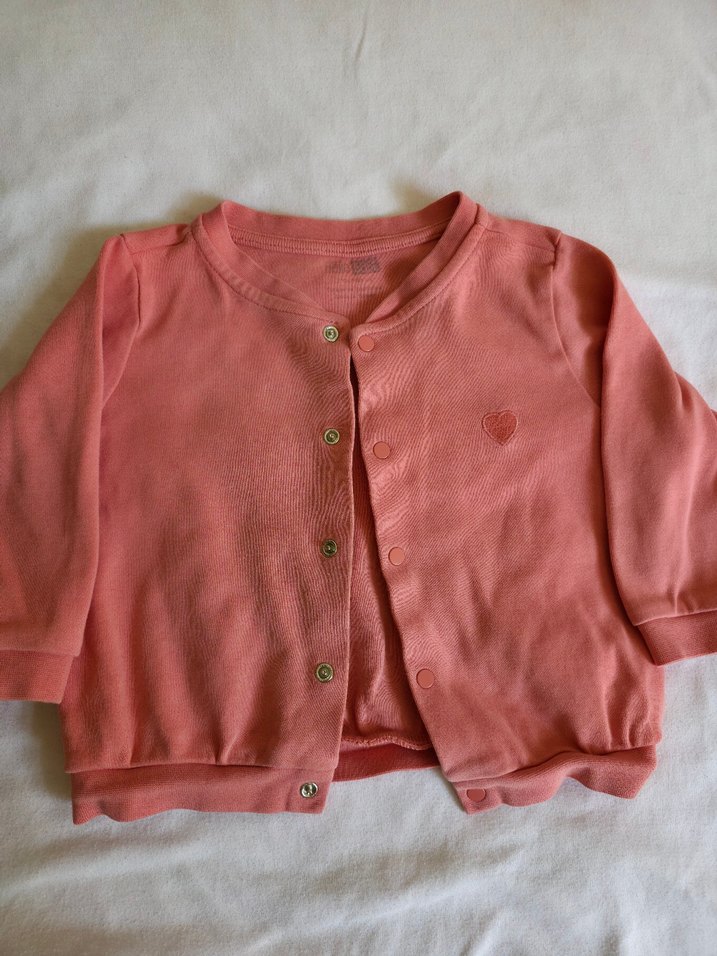 Uzun kollu, düğmeli, bol kesim pembe kız çocuk hırkası. Yumuşak ve sıcak kumaştan, küçük kalp detaylı sade pastel tasarım.