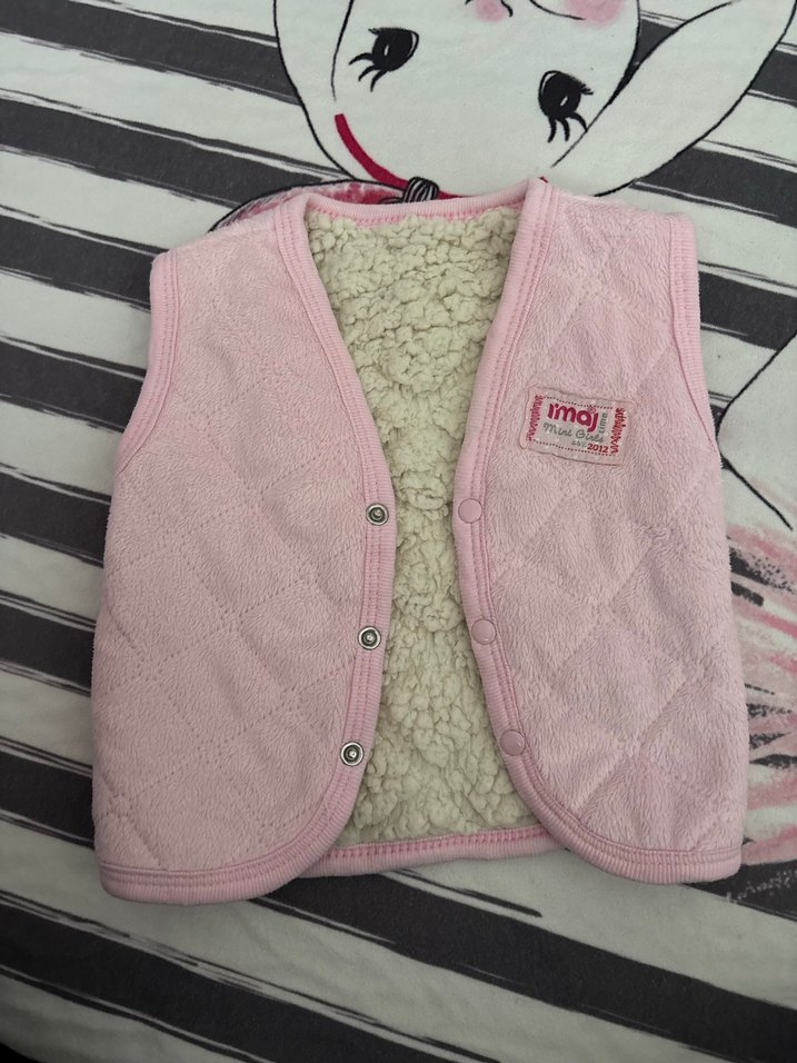 Kız çocukları için düğmeli, V yakalı, pembe renkli ve yumuşak sıcak kumaştan yapılmış fitted yelek. Düz pastel tasarımı günlük kullanıma uygundur.