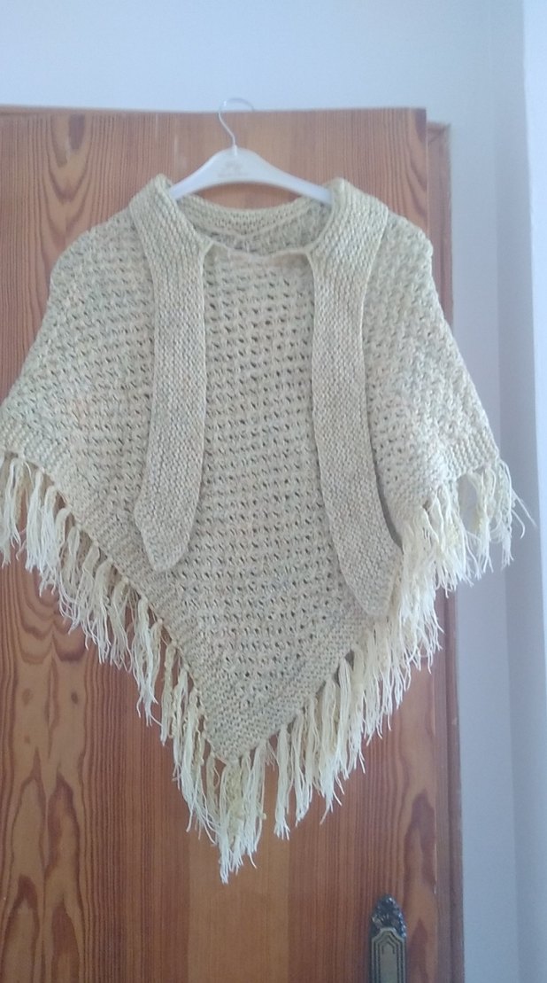 ebruli , örgü dokulu, salaş kesim, yuvarlak yaka ve askılı kollu, püskül detaylı bohem kız çocuk pançosu. 5 10 yaş arası serbest olur