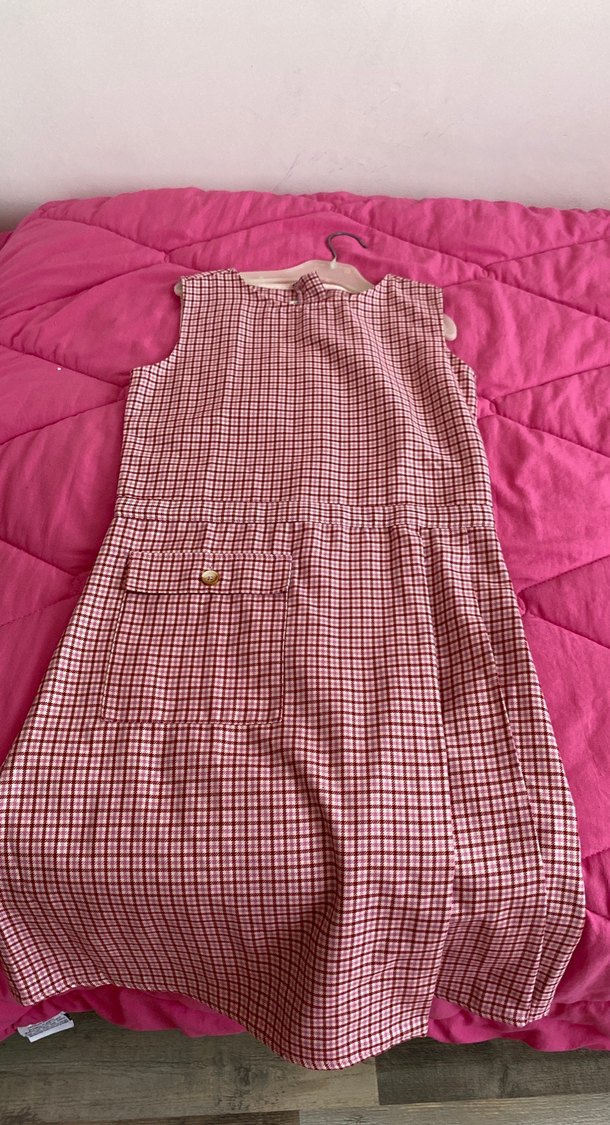 Kolsuz, straplez yakalı kız çocuk elbisesi, pastel pembe ekose desenli ve düğmeli. Bol kesim ve ön cep detayı vardır. Tekstilden yapılmıştır. LCW hediye hiç kullanılmamıştır