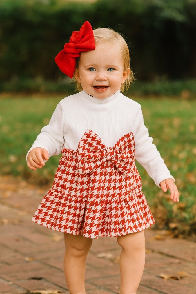 Kız çocuk elbisesi uzun kollu, yüksek yakalı ve bol kesimdir. Kırmızı ekose deseni ve büyük fiyonk detayı vardır. Yumuşak, sıcak kumaştan üretilmiştir.