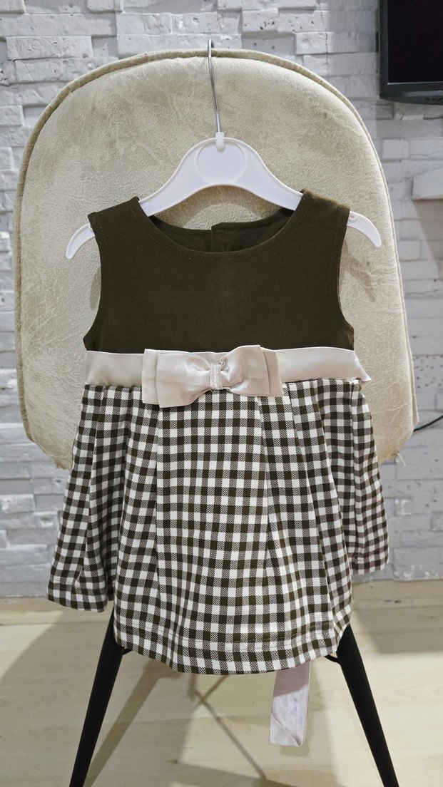 Kolsuz, bisiklet yaka, kahverengi üst kısmı ve gri ekose desenli eteği olan kemerli elbise. Klasik ve modern tarzı birleştirir.