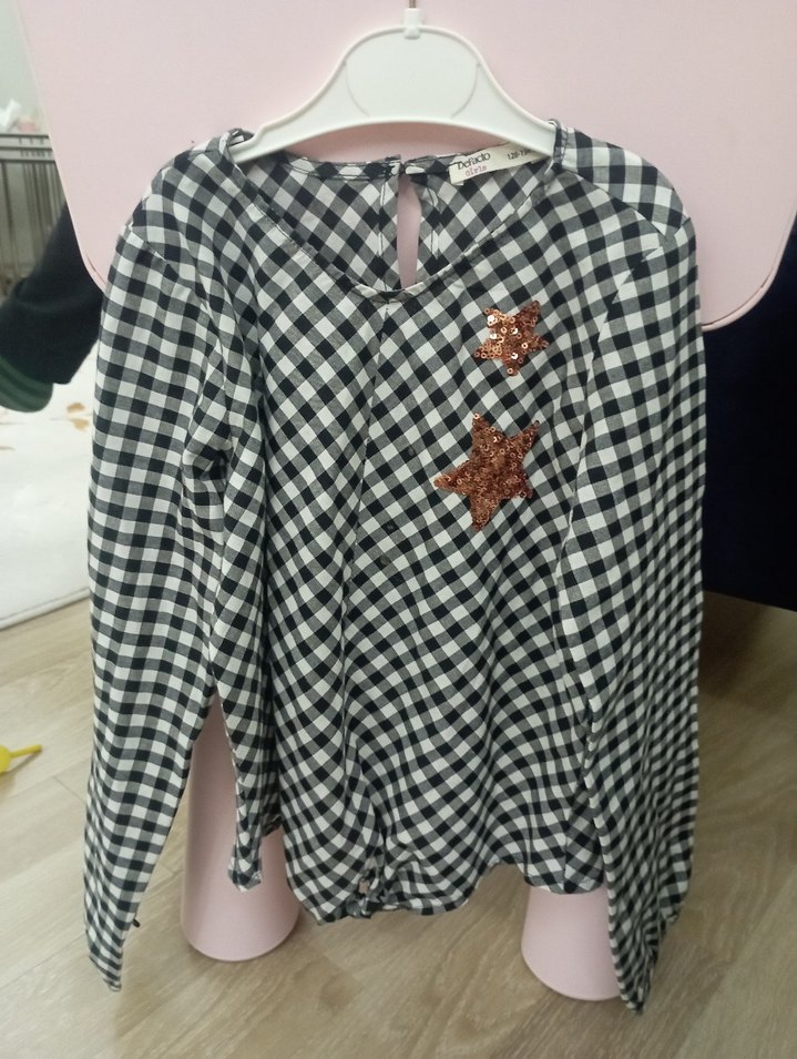 Kız çocukları için bol kesim, uzun kollu ve yuvarlak yakalı bluz. Düğmeli arkası, koyu gri ekose desenli ve yıldız işlemeli, sentetik kumaştan yapılmıştır. ⭐
