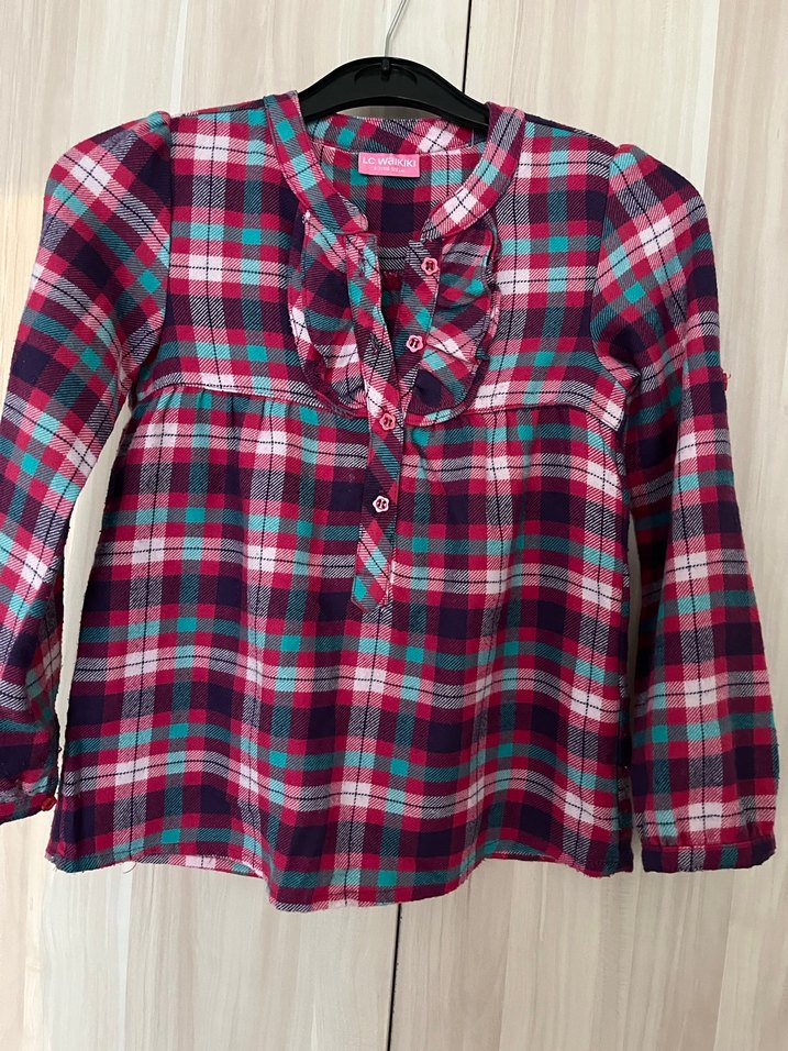 Kız çocukları için uzun kollu, bol kesim ve yakalı gömlek. Renkli ekose desenli, önünde düğmeler bulunur. Yumuşak tekstil kumaştan bohem tarzda.