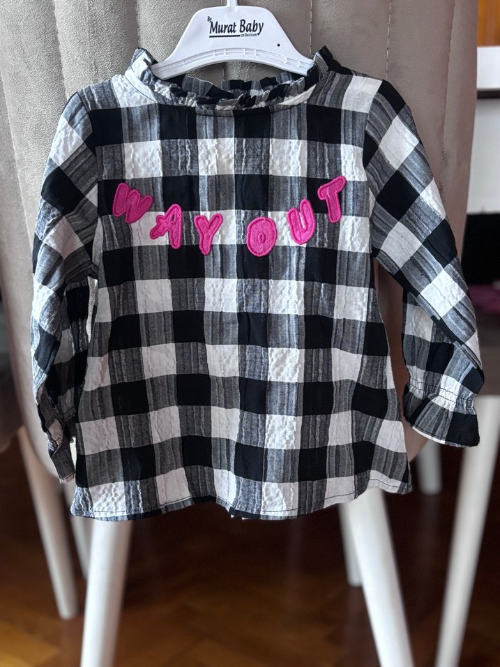 Salaş kesim, uzun kollu, yuvarlak yaka ve düğmeli manşetlere sahip siyah beyaz ekose desenli gömlek. Üzerinde pembe 'WAY OUT' baskısı bulunur. ÇİKOBY