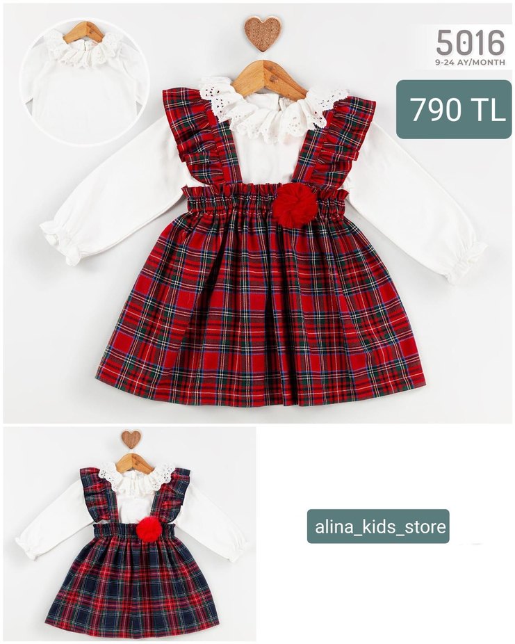 Kız çocuklar için uzun kollu, yuvarlak yakalı ve omuzlarda fırfır detaylı bluz ve ekoseli elbise. Yumuşak ve sıcak kumaştan yapılmıştır, işlemeli desen ve belde süs ponponu vardır. 9-24 ay arası için uygundur.