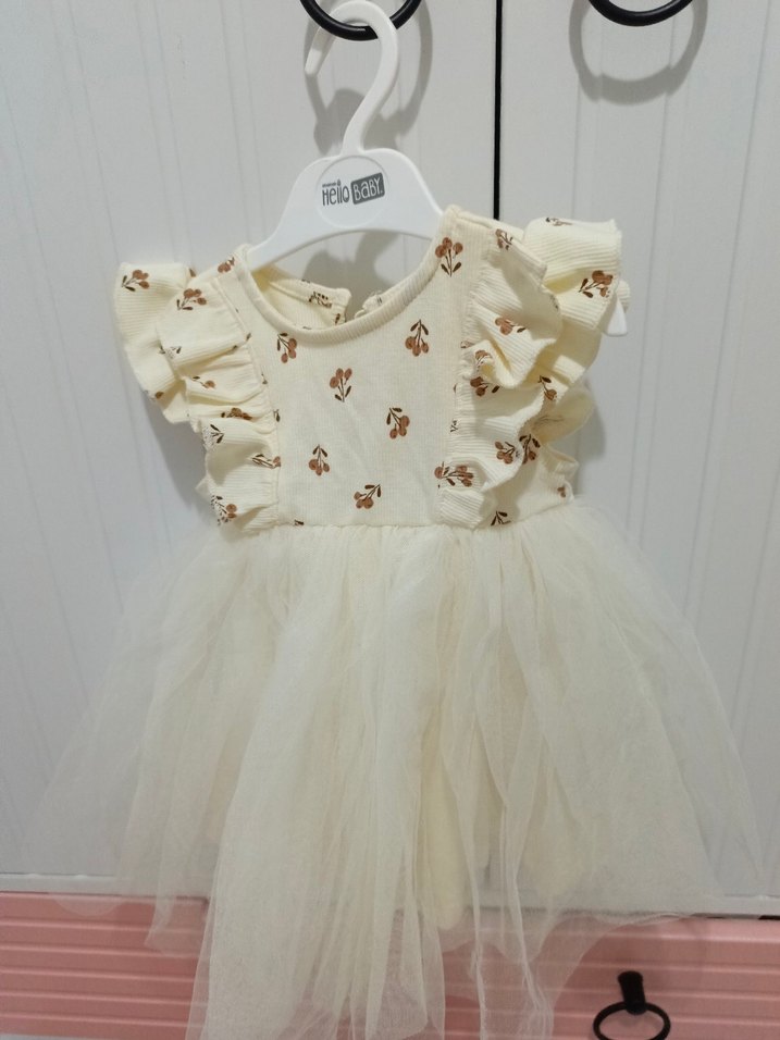 Fırfırlı kolları ve baskılı desenleriyle ekru renkli, pamuklu, bohem tarzda kız çocuk elbisesi. Straplez yakalı, hafif ve uçuşan etekli.