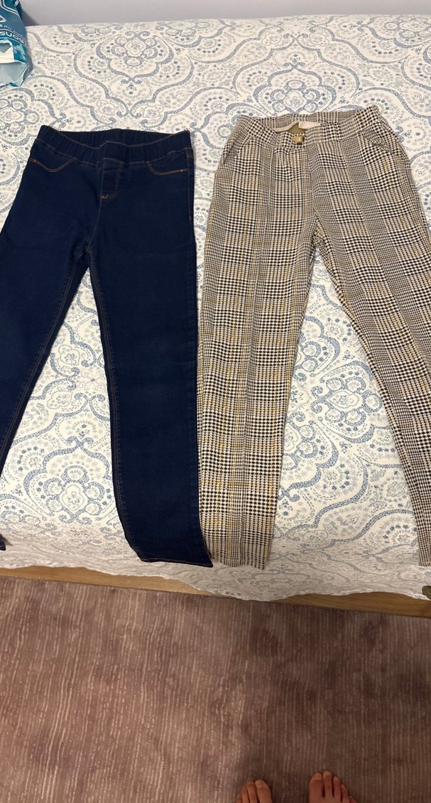 Kız çocuklar için elastik bel özellikli, biri koyu denim diğeri çok renkli desenli, dar kesim pantolonlar. İkisi birlikte fiyatıdır