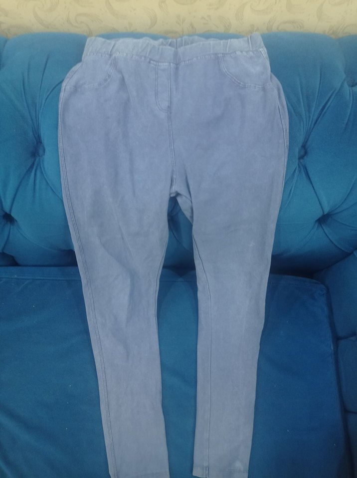 Yumuşak denim kumaştan yapılmış, pastel mavi tonunda kız çocukları için elastik bel bantlı, sade ve desen içermeyen dar kesim pantolon. 10_11 yaş için uygundur ince kumaşlı koy görünümlü tayt