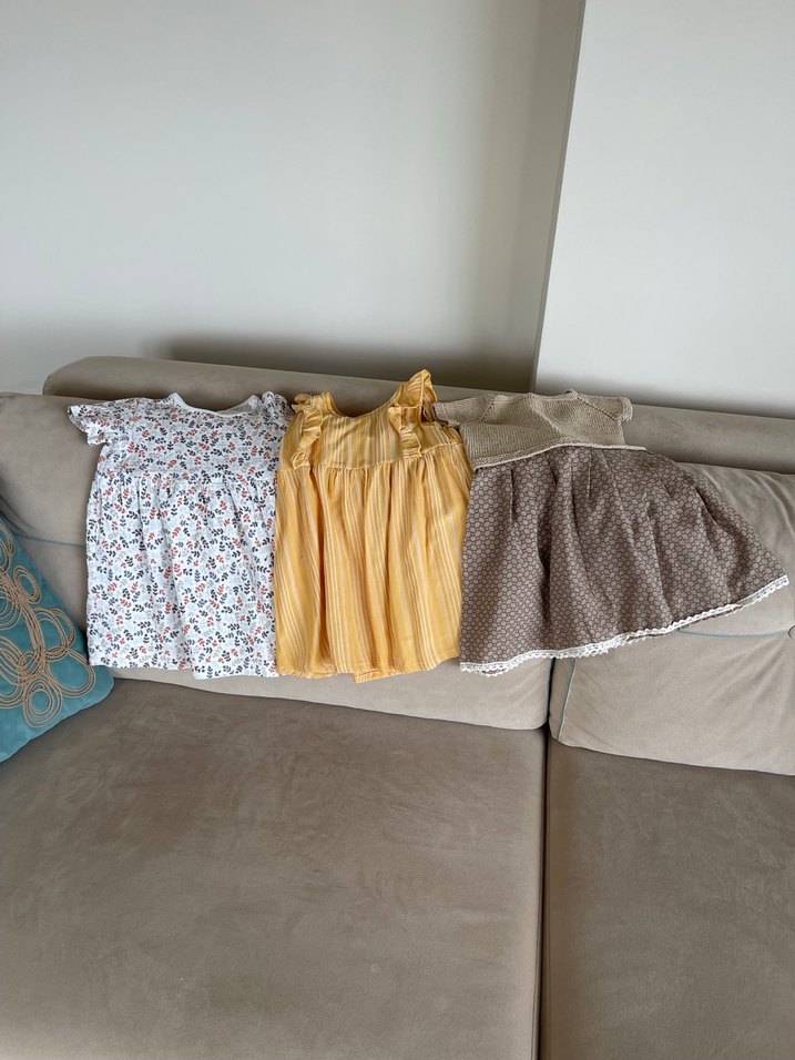 En soldaki beyaz Müslin kumaş çok iyi para vererek almıştım yumuşacık bir dokusu var %100 pamuk markası pambuliq ,18/24 ay yazıyor ama üç yaşa kadar çok rahat olur, cirt olmayan böyle çok tatlı bir sarı beyaz çizgileri var ebebek‘ten alınmıştı dört yaş yazıyor ama kalıbı dar elbise, diğeri de çok tatlı örme altı fistolu elbise, yalnız beklemekten dolayı böyle kırçıllı gibi hafif sararma olmuş yıkanınca geçer mi bilmiyorum bir de koltuk altında hafif bir acıma var elle dikilecek herkesin nereden aldığımı sordugu çok güzel bir elbise….