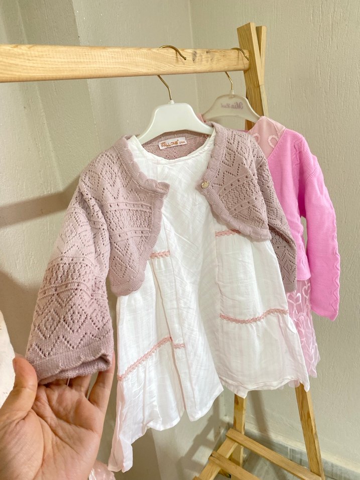 Uzun kollu, yuvarlak yaka, nakışlı ve pastel pembe örgü kumaştan bohem tarzı kız elbisesi.