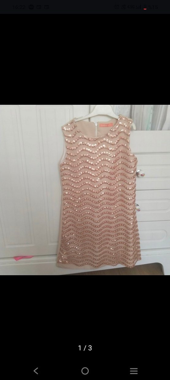 Kolsuz, kısa elbise, vücuda oturan kesim ve yuvarlak yaka ile parıldayan payet işlemelidir. Astarlıdır✨