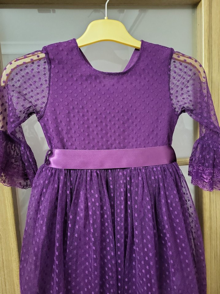 Mor renkte, dantel detaylı uzun kollu, V yakalı ve beden oturan klasik tarzda kız çocuk elbisesi. Canlı renkleriyle şık bir seçenek.
