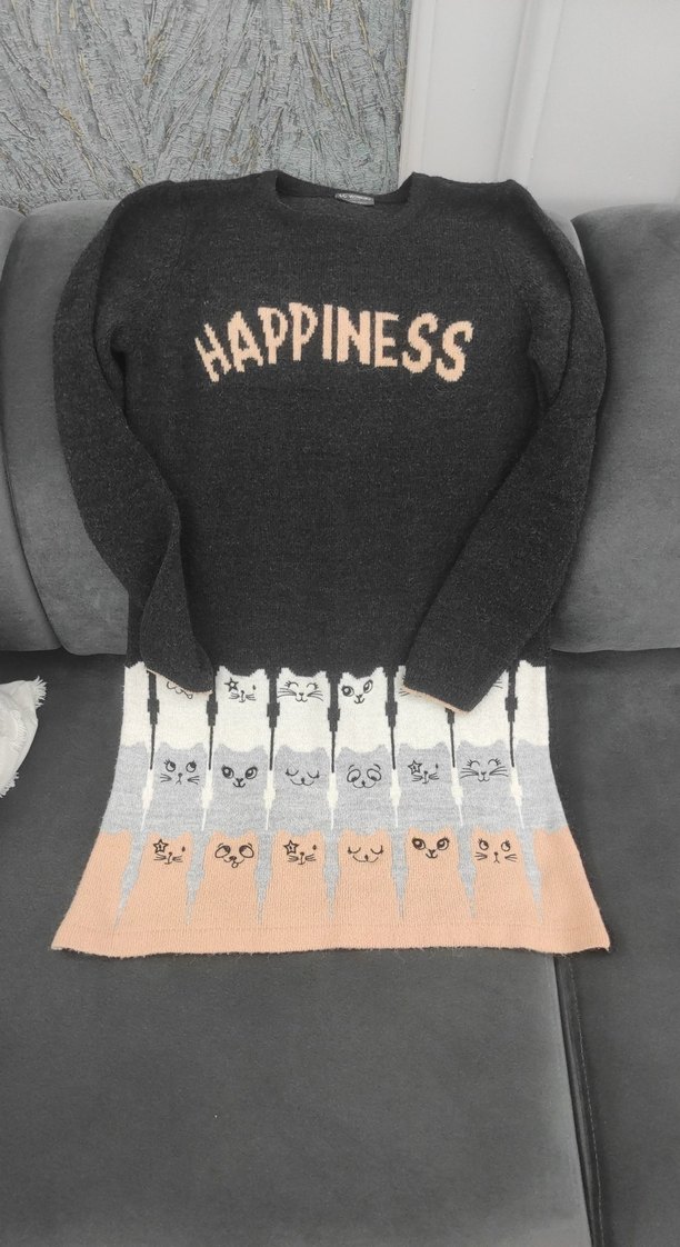 Gri örgü uzun kazak, üzerinde "HAPPINESS" yazısı ve alt kısmında sevimli kedi desenleri bulunur, rahat ve eğlenceli bir tarz sunar.