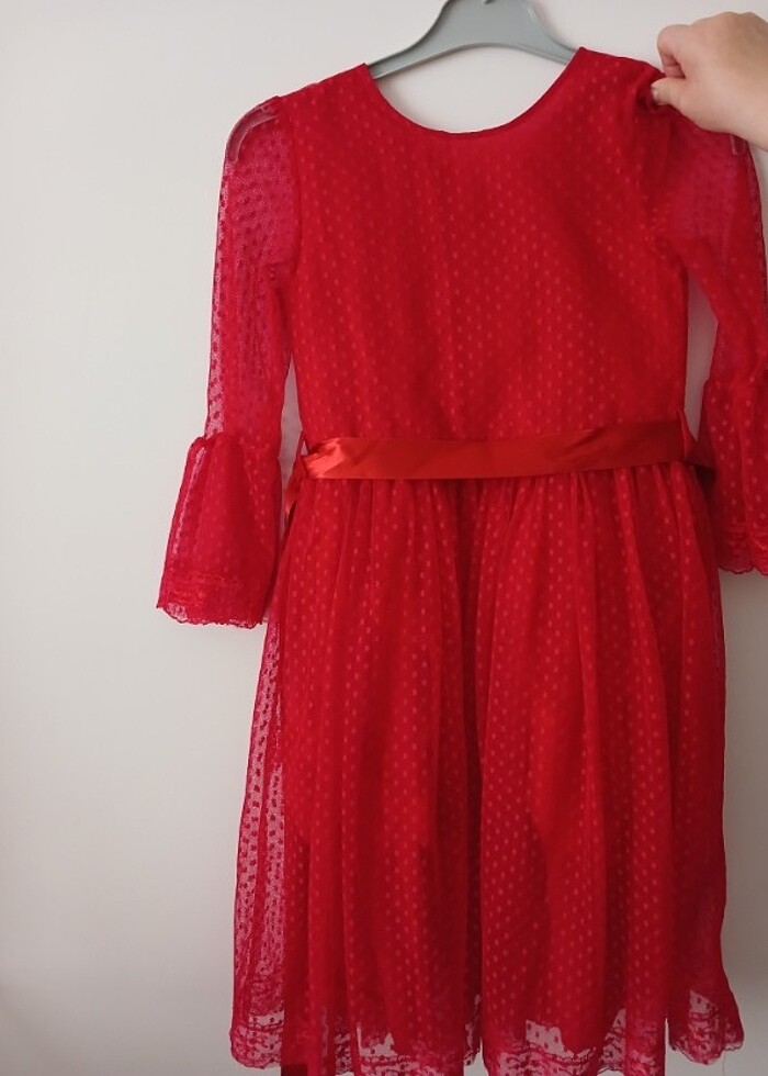 Kız çocuk elbise. 2 defa giyildi Hiçbir kusuru yok. Küçük geldiği için satıyoruz İki koltuk arası bel 37 Boy 92 santim 13 14 yaş Kırmızı elbise