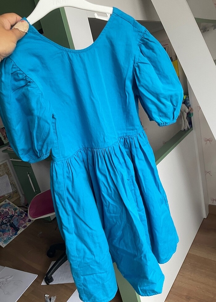 Katlı olduğu için biraz kırışık görünüyor resimde.ütülendiğinde harika görünecektir.Kızıma çok severek aldım fakat rengini sevemedi ve giymedi