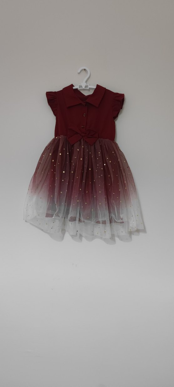 Bordo renkli, kolsuz, V yakalı kız çocuk elbisesi, fırfır detaylı ve beli oturan kesimlidir. Tie-dye etek kısmı, parlak ve küçük ışıltılı tül ile tamamlanmıştır. ürün boy 60 cm en 60 cm (güneş ışığında yıldızları parlıyor)