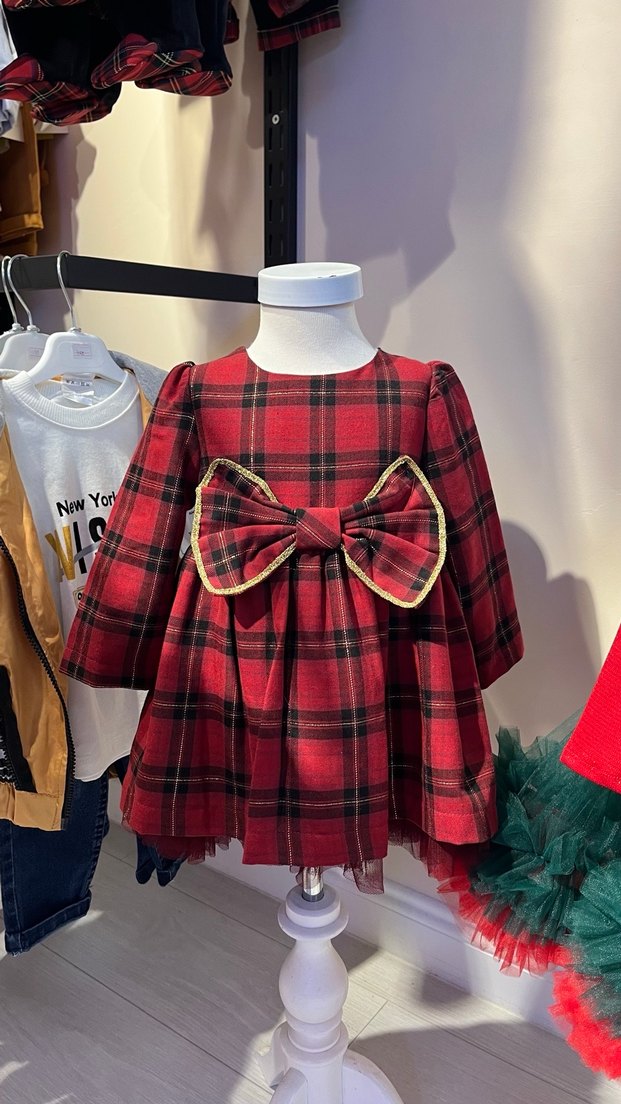 Uzun kollu, yuvarlak yakalı ve büyük fiyonk detaylı kırmızı ekose desenli kız çocuk elbisesi. 6-9-12-18 ayları mevcut