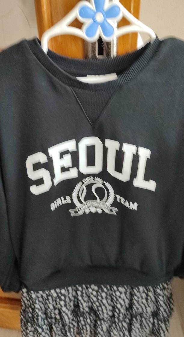 Fitted kesim, yuvarlak yaka, uzun kollu siyah kız çocuk'SEOUL' baskılı,