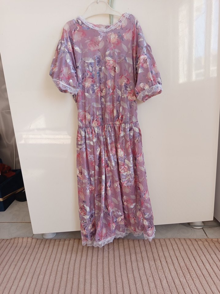 Mor bağlama desenli, dantel detaylı, kısa kollu, yuvarlak yakalı bol kesim uzun elbise. Yumuşak sentetik kumaştan yapılmıştır, günlük kullanıma uygundur. kumaşı kadifedir