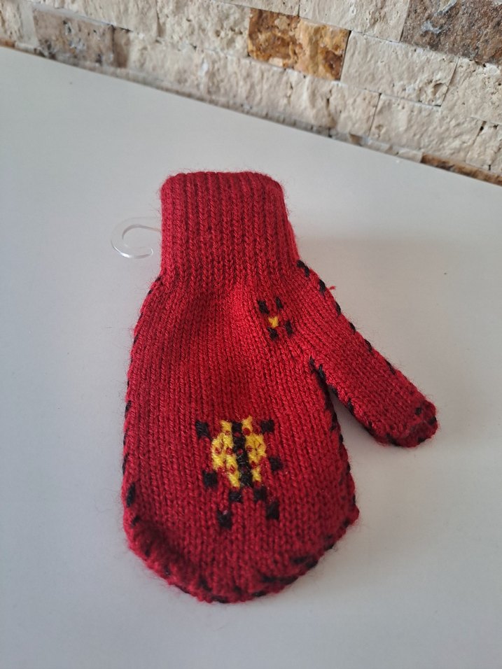 Kız çocukları için renkli nakışlı desenlere sahip kırmızı örgü eldiven. Yumuşak örgü kumaş sıcaklık ve konfor sunar. 1/2 yaş ile uyumludur.