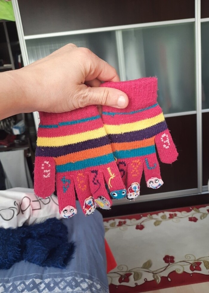kız çocuk için çok şirin eldivenler.4-5-6 yaş icin uygundur.lekesi yipranmasi yoktur. Parmaklarında sayılar ve figürler vardır