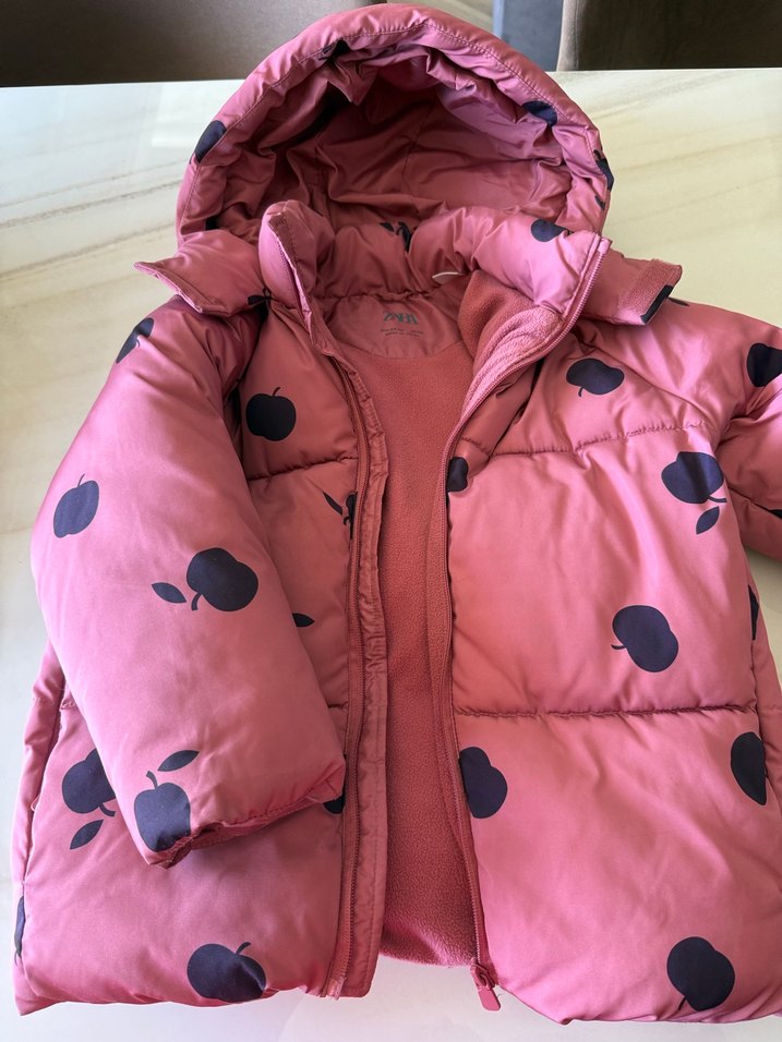 Kız Çocuk Elma Desenli Kapüşonlu Mont