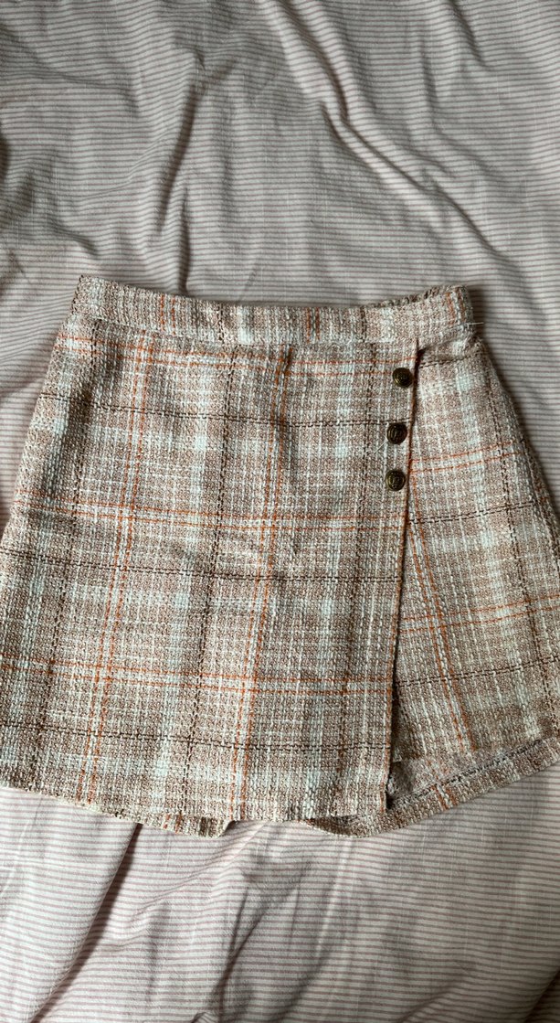 Düğmeli, gevşek kesim kadın mini etek, bej ve kahve tonlarında ekoseli desene sahip, yumuşak sentetik kumaştan üretilmiştir.