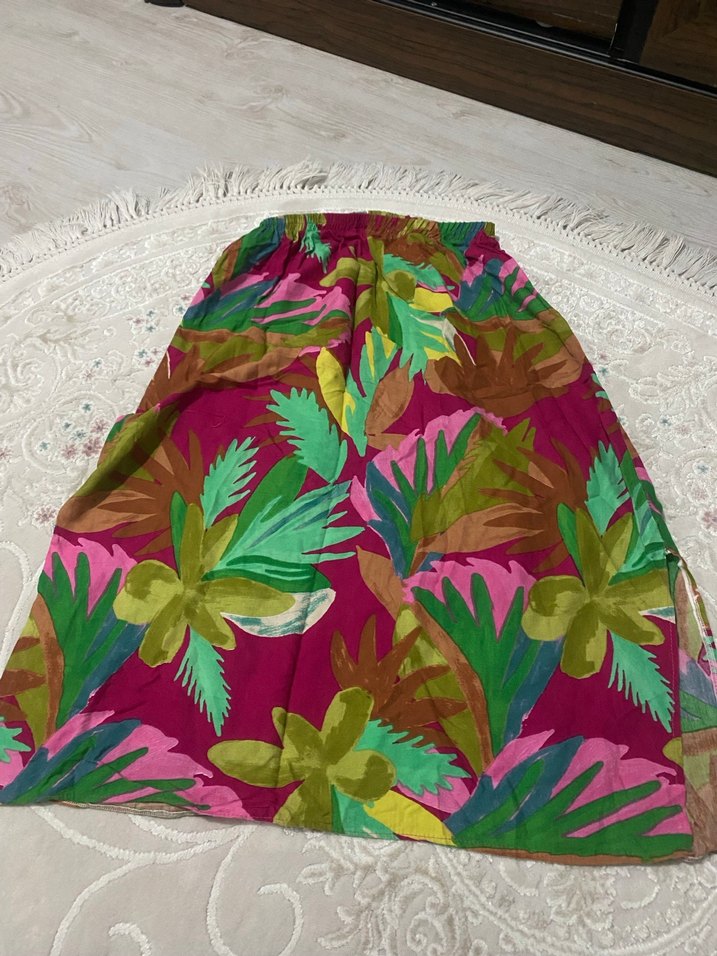 Renkli bohem uzun etek, bol kesim ve canlı batik desenli tekstil kumaştan, plaj için uygun.