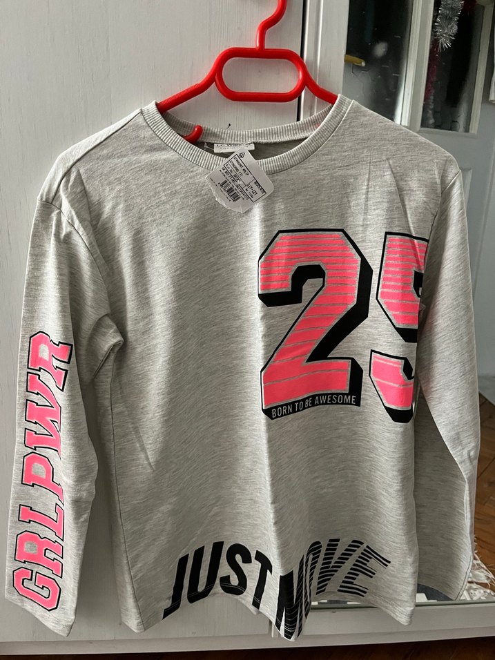 Gri renk, uzun kollu kız çocuk tişörtü, bol kesim ve yuvarlak yaka. "25" ve "GRL PWR" baskılarıyla sokak stilini yansıtır, cırt cırtlı detay içerir. Etiketli üründür. Hiç kullanılmadı.