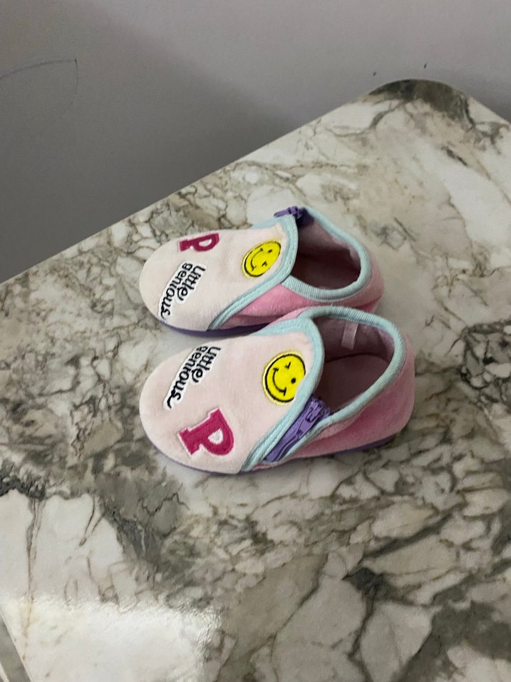 Hediye geldi. Numarası uymadığı için hiç sadece 1 kez giyildi. Tertemizdir . Kız çocukları için renkli tie-dye desenli, fermuarlı, yumuşak ve sıcak terlik. Üzerinde gülen yüz ve P ha